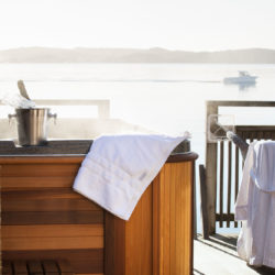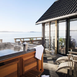 Enjoy the wonderful view of the Gullmarsfjord’s inlet through the two glass walls towards the sea. The comfortable double bed from “Carpe diem – beds of Sweden – is 160 cm wide. There is extra sleeping space in the loft in case you would like to stay with more than two persons. Your own sun deck with private outdoor hot tub and furniture, deckchairs and bathing ladder is included.