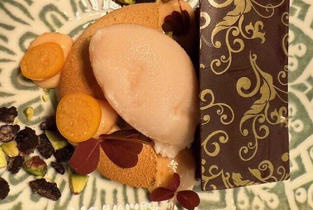 Chocolate brownie with pistachio cream & crispy kadaif, served with white chocolate mousse infused with green jasmine tea