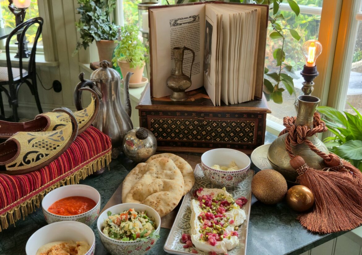 Tabbouleh, baba ganoush, labneh with pomegranate & pistachios, hummus, muhammara, naan bread